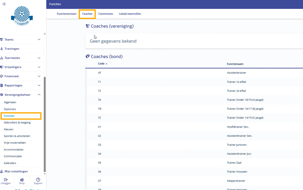 Coaches maak je aan via "Functies" onder "Verenigingsbeheer"