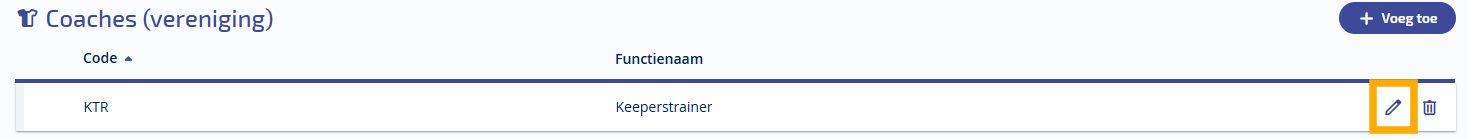Elke aangemaakte coachfunctie kun je wijzigen met het potloodje aan het einde van de regel. Met de prullenbak verwijder je de betreffende coachfunctie.