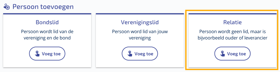 Een relatie is iemand die buiten de vereniging staat en waarvoor geen contributie wordt geïnd. Het is geen lid van de vereniging. Hierbij kun je denken aan sponsoren, contactpersonen bij de gemeente, donateurs of oud-leden die je op de één of andere manier nog wilt kunnen contacten voor bijvoorbeeld een reünie.