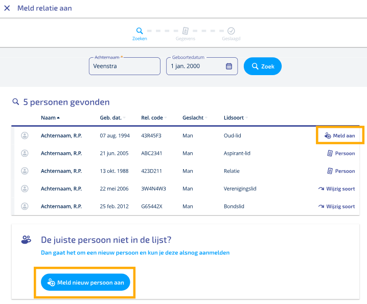 Bij het aanmelden van een relatie word je als eerste gevraagd om een naam en geboortedatum van de nieuwe relatie zodat het systeem kan zoeken of deze al bij jullie vereniging bekend is. In dat het geval geeft het systeem een aantal mogelijkheden.