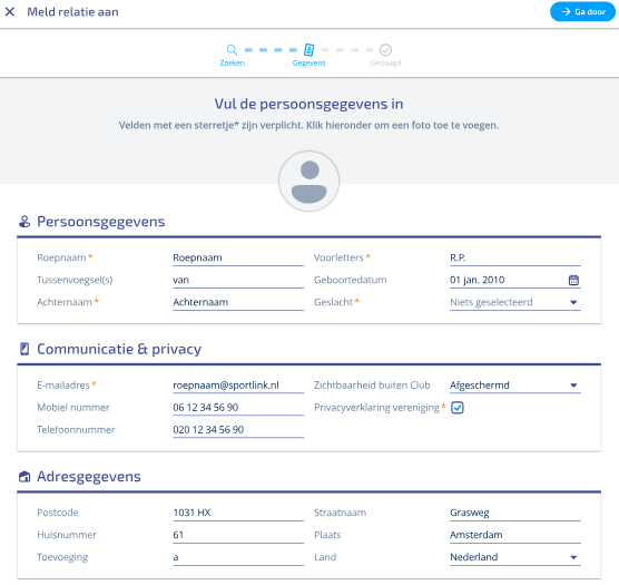 Afhankelijk of je een relatie helemaal nieuw gaat aanmelden of dat je een bestaand lid gaat her aanmelden dien je in onderstaande afbeelding de persoonsgegevens te controleren en aan te vullen dan wel compleet opnieuw in te vullen.