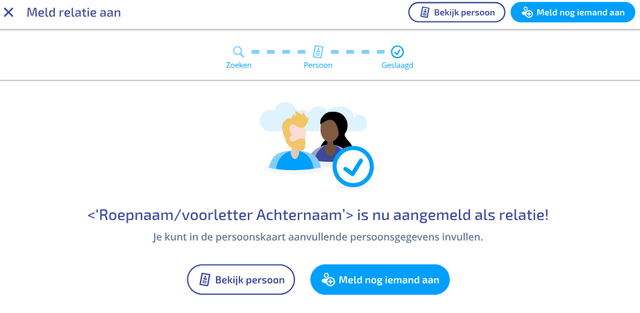 Gefeliciteerd! De relatie is aangemeld. Je hebt nu de keuze om de nieuwe relatie te bekijken of direct nog iemand aan te melden.
