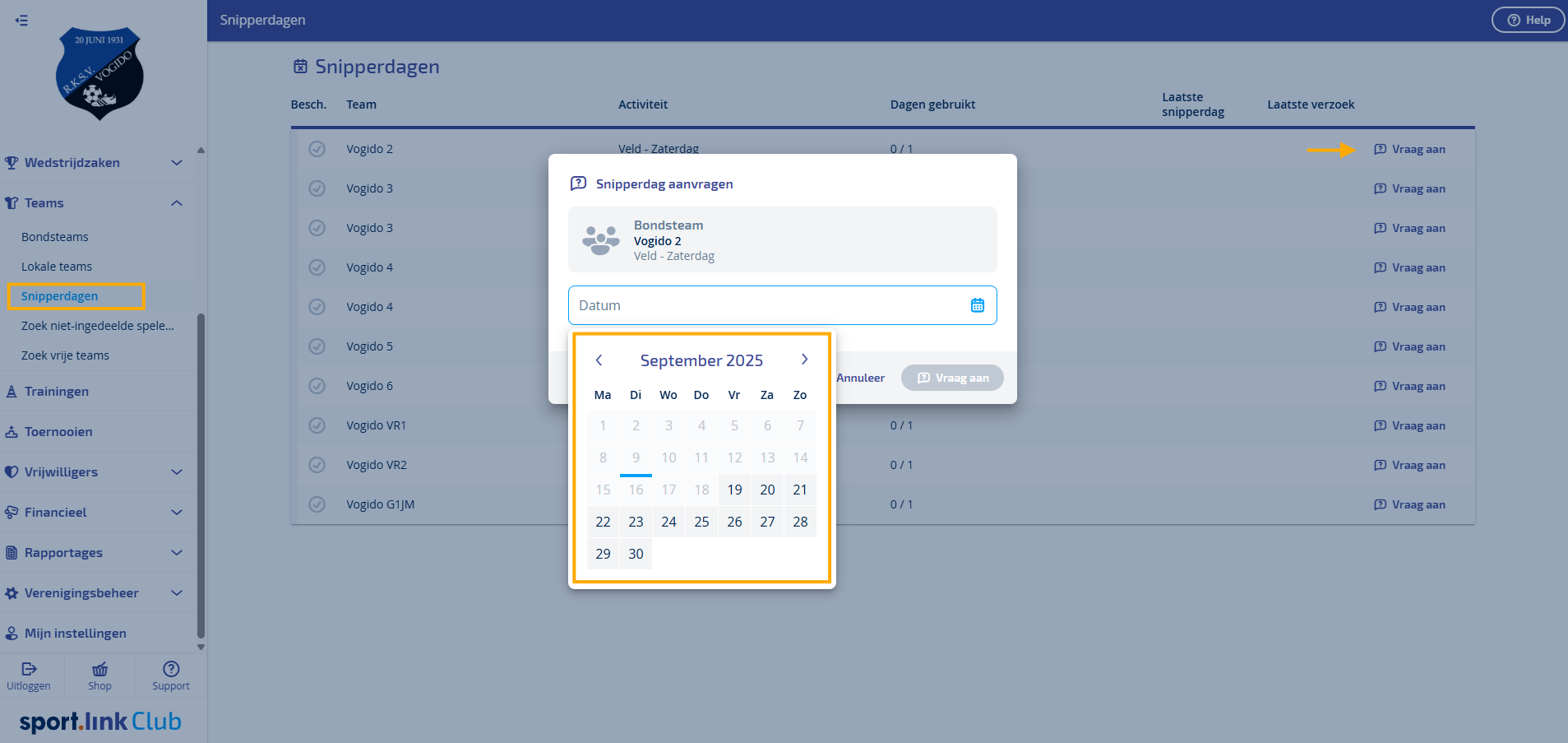 In Sportlink club kun je een snipperdag aanvragen via het menu Teams en dan Snipperdagen. Daar tref je een lijst aan met de teams waarvoor een snipperdag aangevraagd kan worden. Achter de teamnaam staat "Vraag aan" en hiermee open je het aanvraagscherm. Kies vervolgens een datum en vraag de snipperdag definitief aan. Zie ook onderstaande afbeelding