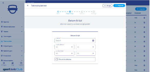 Vul de basisinformatie van het toernooi in, zoals de datum waarop het toernooi wordt gespeeld, het aantal poules en de lengte van de wedstrijden.