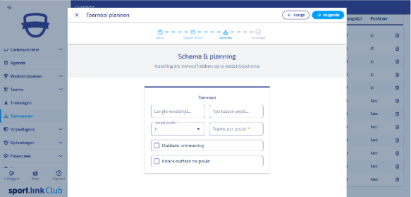 Nadat je alle informatie in deze drie stappen hebt ingevoerd, maakt Sportlink Club het toernooi-schema. De basis staat! Vervolgens heb je nog veel meer mogelijkheden om het toernooi vorm te geven. Dit doe je via de tabbladen boven in je beeldscherm (Algemeen, Accommodatie, Teams etc).