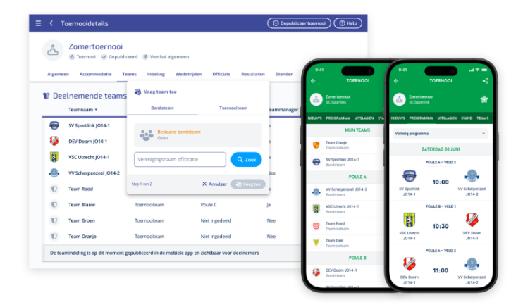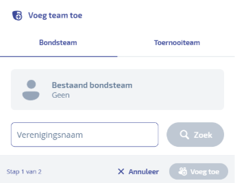 Klik links op de optie ‘bondsteams toevoegen’. Zoek de juiste vereniging en klik vervolgens op het team dat je wilt toevoegen. Een groot voordeel is dat meteen ook alle bondspelers uit het team worden betrokken bij het toernooi.
