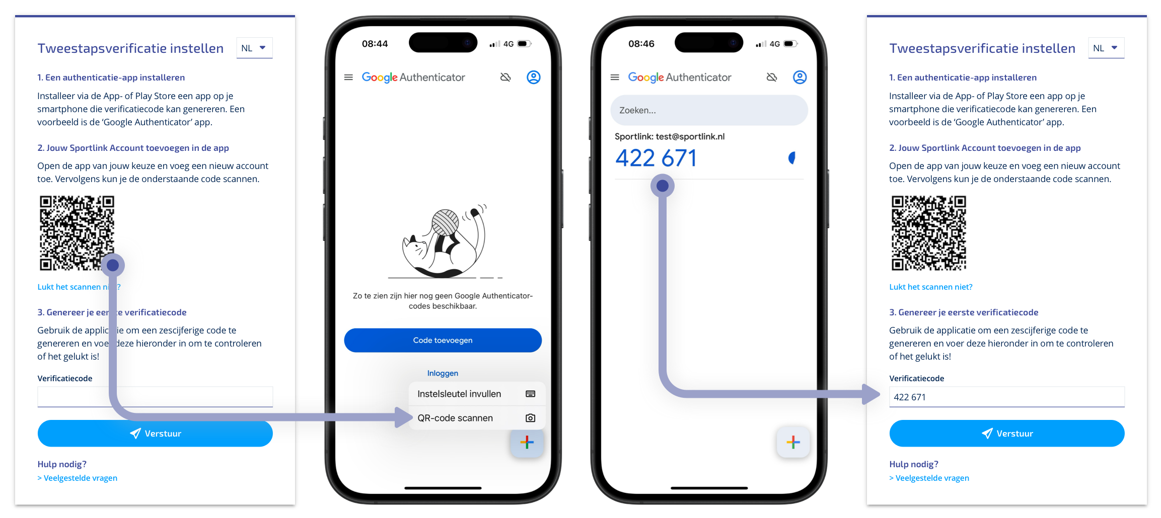 Zodra je een QR-code in beeld ziet open je de app van jouw keuze en gebruik je de plus-knop (+) om een nieuwe service toe te voegen; in dit geval jouw Sportlink Account. Kies voor het Scannen van een QR Code en scan met de camera in de app de code op je scherm. Deze code kun je invoeren in het scherm en je hebt tweestapsverificatie ingesteld!
