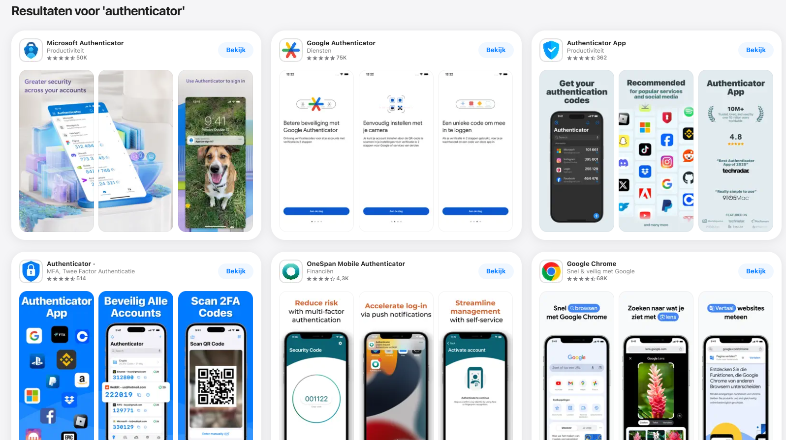 De allereerste keer dat je inlogt met je account wordt je gevraagd om tweestapsverificatie in te stellen. Voor het instellen van tweestapsverificatie heb je een authenticator app nodig. Je kunt er zelf één kiezen en deze installeren via de App Store of Play Store. Misschien gebruik je er al één voor je werk of andere online services.