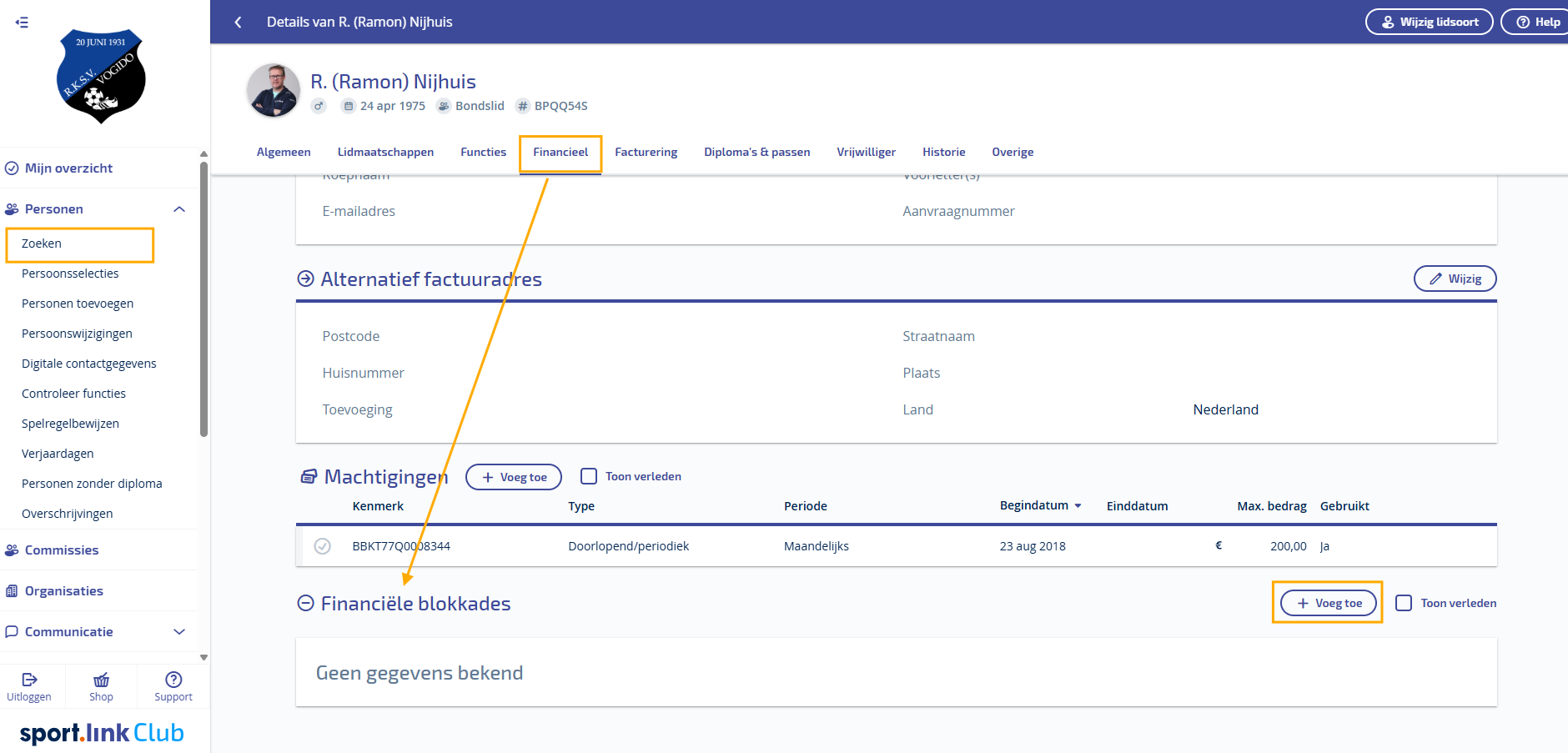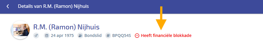 Een financiële blokkade kan alleen worden ingesteld wanneer het lid een actieve speelactiviteit heeft binnen de vereniging. Zonder speelactiviteit kan er géén financiële blokkade worden toegevoegd.