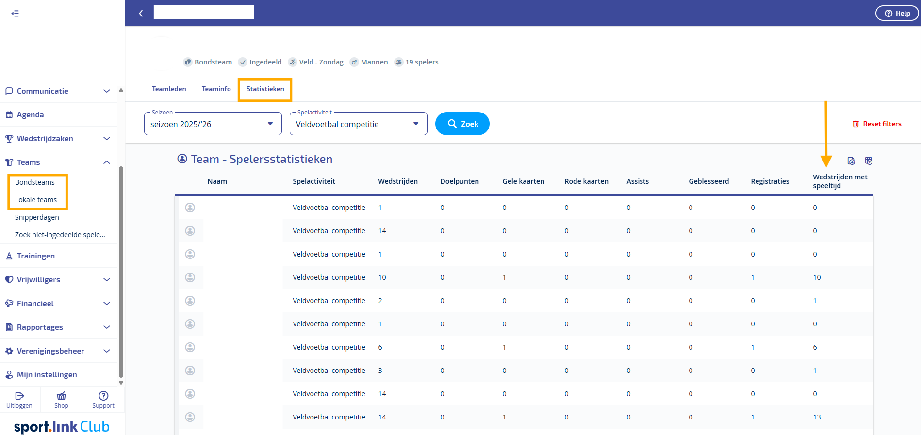 Ga in het menu naar Teams-Bondsteams en kies vervolgens het team waarvoor je de statistieken wilt inzien.