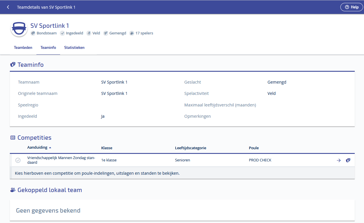 Hier wordt vervolgens het onderdeel "Teaminfo" getoond. Dit zijn statische gegevens.